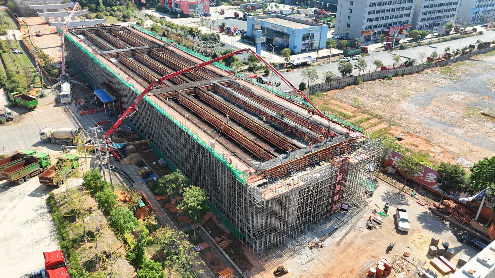 9月23日22時零5分及9月26日凌晨4時,G320高安境內(nèi)改線項目工程(森澤大道高架互通)等截面及變截面現(xiàn)澆箱梁首次混凝土澆筑均順利完成。此次澆筑的等截面現(xiàn)澆箱梁為第十二聯(lián)(40m+40m+40m)四室混凝土現(xiàn)澆連續(xù)箱梁,變截面現(xiàn)澆箱梁為第八聯(lián)(40m+60m+40m)四室混凝土現(xiàn)澆連續(xù)箱梁。作為項目現(xiàn)澆箱梁施工的首次實操,其質(zhì)量水平和工藝標準對后續(xù)現(xiàn)澆箱梁施工具有重要的示范作用和指導(dǎo)意義。