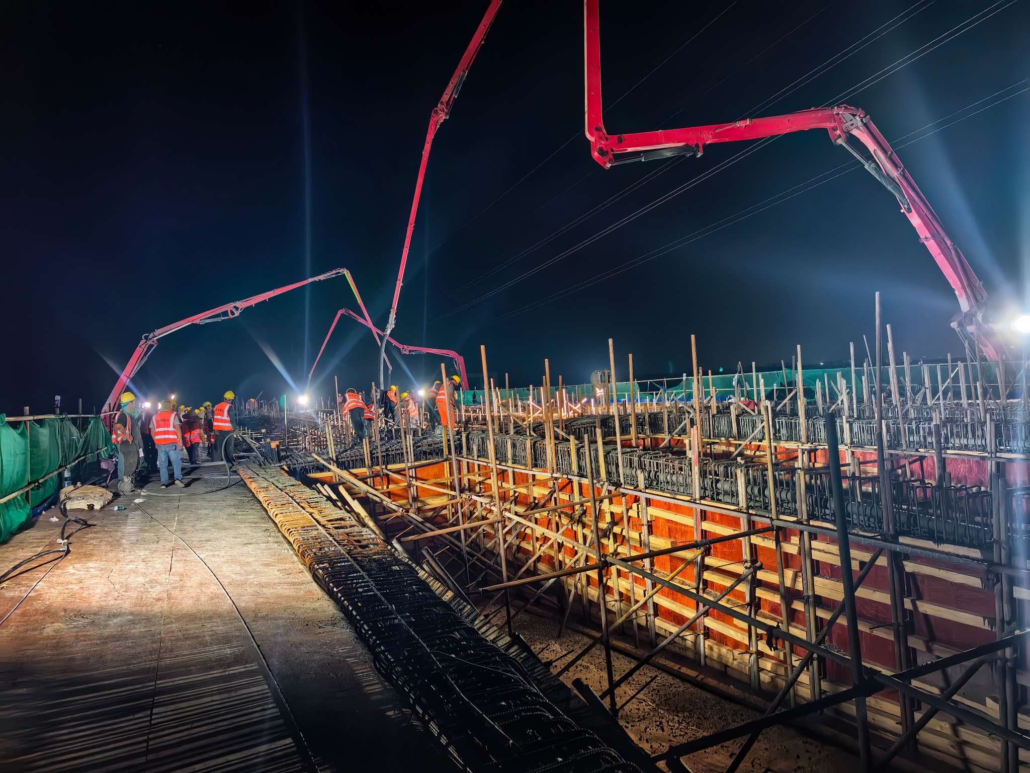 澆筑過程中,公司董事長彭家遠及指揮部、項目辦領(lǐng)導(dǎo)均親自蒞臨現(xiàn)場指導(dǎo)工作,總監(jiān)辦及經(jīng)理部現(xiàn)場管理人員全程跟班作業(yè),實時監(jiān)控混凝土運輸、入模、振搗等關(guān)鍵環(huán)節(jié),確保施工質(zhì)量可控、可追溯。等截面現(xiàn)澆箱梁(實際澆筑1223方混凝土)和變截面箱梁(實際澆筑1902方混凝土)分別經(jīng)過全體工作人員15小時和22小時連續(xù)奮戰(zhàn),首次混凝土澆筑均順利完成,施工質(zhì)量符合設(shè)計與規(guī)范要求。